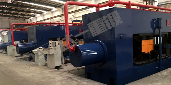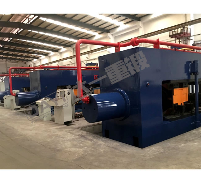 汽车车桥挤压生产线是我公司针对挂车车桥生产工艺自主开发的新型设备,具有自主知识产权。该生产线包含中频加热炉、送料机械手、车桥挤压机等部分,将原车桥摩擦焊接、单边旋压等工艺替换为双头热挤压工艺,可一次性挤压出高质量车轴,有效地提高了生产效率、降低了生产能耗。